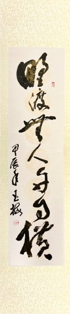 Executed in wild cursive script (狂草), the brushwork is vigorous yet spacious, with gold medallions stamped behind the ink that subtly allude to cosmic harmony or the passage of time. The spontaneous force of the strokes contrasts with the stillness of the meaning, creating a layered dynamic between movement and stillness, action and inaction. It is a scroll not meant to be merely read, but felt.