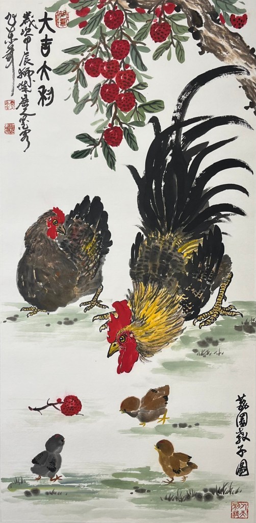 The Way of Wisdom and Auspice (荔园教子) is an evocative ink painting which serves as both a visual metaphor and a cultural blessing. Rooted in traditional Chinese philosophy, the artwork conveys a dual intention: it symbolizes the teaching of essential survival wisdom to children while simultaneously invoking the auspicious energies of prosperity and good fortune.