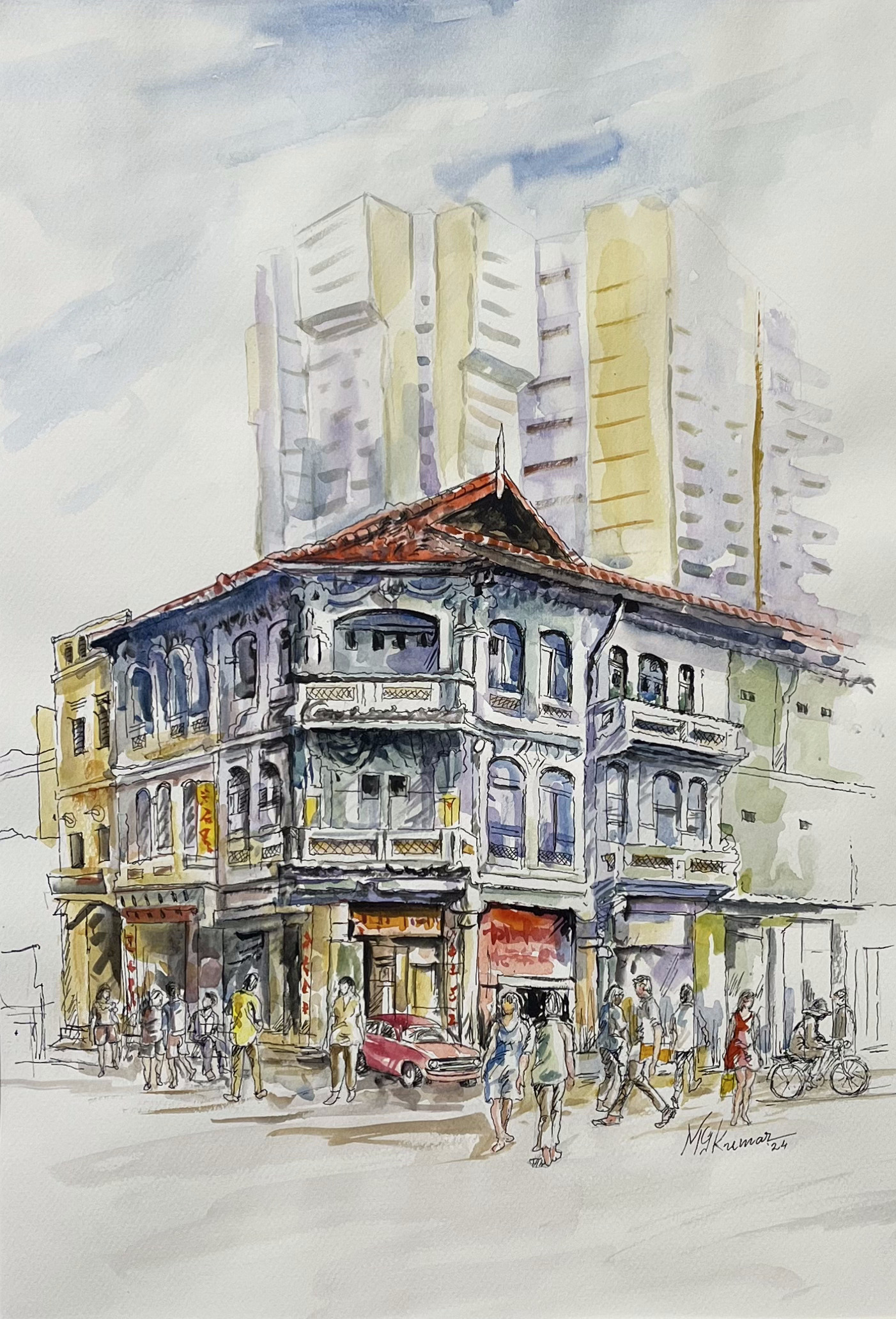 “Heritage & Modernity” is an evocative watercolour piece, showing the timeless charm of Singapore’s architectural heritage meets the towering presence of modern urban life. Kumar captures a vibrant street corner featuring a classic shophouse — its intricate façade, ornate windows, and red-tiled roof lovingly rendered in soft yet expressive washes.