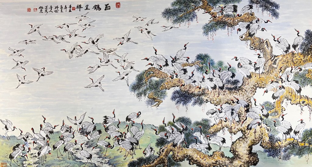 The composition is framed by an ancient, gnarled Pine Tree, which in traditional Chinese culture, the pine tree is known to live for a thousand years, revered for its longevity, endurance and vitality, often associated with the ability to thrive even in harsh conditions. Its twisting golden branches and lush green needles offering a dynamic structure that supports the gathering of cranes. In addition, the red-crowned crane (丹顶鹤) is a revered creature representing longevity, nobility, and spiritual transcendence. Traditionally believed to also live for a thousand years, cranes are often associated with immortality and are seen as messengers of harmony and peace.