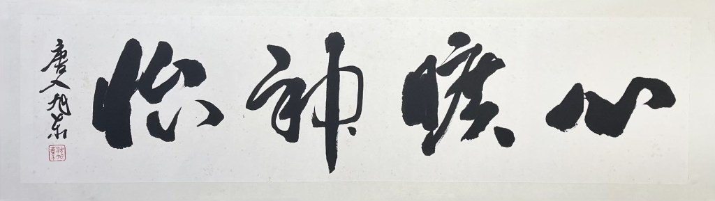 Executed in semi-cursive script (行草書), Shen captures not only the elegance of traditional Chinese calligraphy but also the emotional essence behind the words. The spacious composition and confident brushwork reflect the very meaning of the phrase—liberation of the mind and elevation of the spirit.