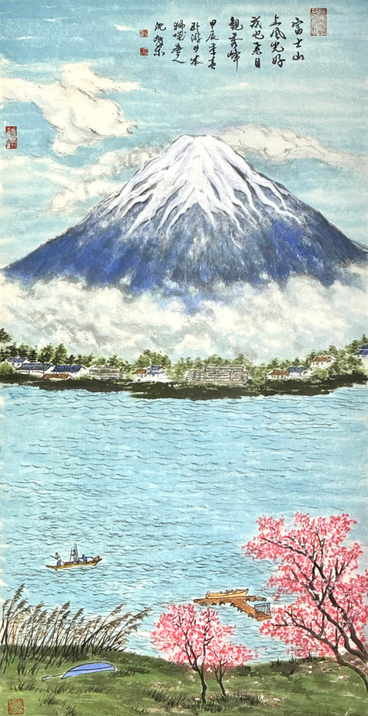 The artist captures his emotions upon witnessing Mount Fuji during the cherry blossom season, with snow gently cascading from its peak before a serene river. At the mountain’s base, small houses and ryokans are nestled, while people row boats along the river, creating a picturesque scene filled with vibrant life.