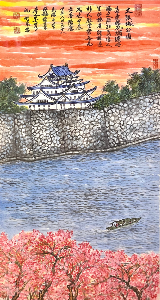 The artist captured a sunset scene at Osaka Castle Park, where the warm hues of the orange skyline harmonized with the soft pink of the cherry blossoms near the river.