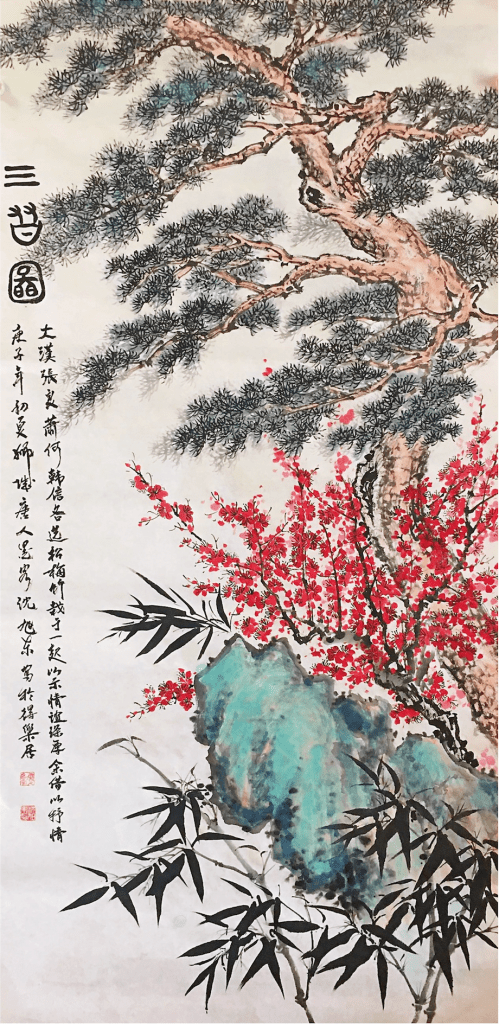 The Three Friends is a Chinese painting that draws inspiration from the famous figures of the Han Dynasty—Xiao He, Zhang Liang, and Han Xin—three key contributors to the founding of the Han Empire. In this artwork, bamboo, plum blossoms, and pine trees are depicted together, symbolizing the enduring and deep friendship shared by these historical figures. These three plants, known as the “Three Friends of Winter” (岁寒三友), are traditional symbols in Chinese culture, representing strength, resilience, and integrity, especially in difficult times.