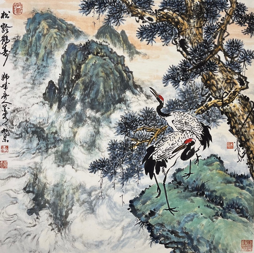 In Pine-like Age and Crane-like Longevity Shen brings to life the timeless theme of longevity. A pair of red-crowned cranes—icons of grace, purity, and long life—stand poised on a pine-covered cliff, gazing serenely across a sea of clouds toward distant mountains.